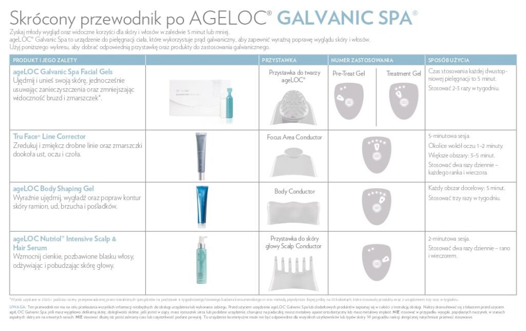 Z urządzeniem ageLOC Galvanic Spa i kosmetykami uzupełniającymi można uzyskać szereg korzyści przeciwstarzeniowych w komfortowych warunkach własnego domu.