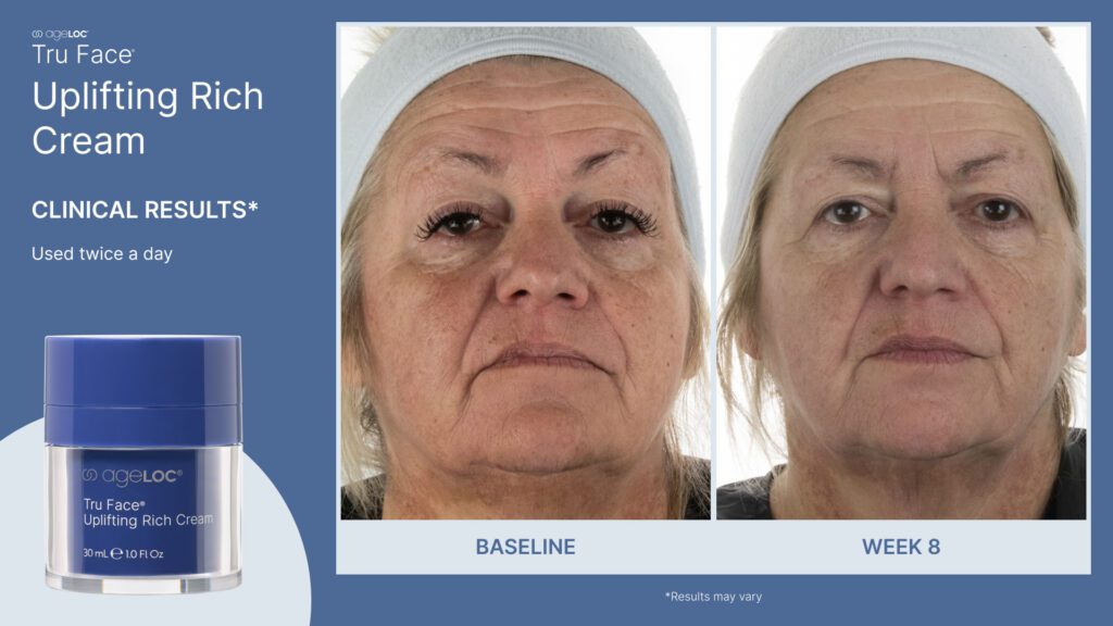 Wyniki uzyskane z 8-tygodniowej oceny klinicznej in vivo, przeprowadzonej przez niezależnych specjalistów metodą pojedynczo ślepej próby, wykonanej na 30 uczestniczkach w wieku od 45 do 65 lat. Uczestniczkom badania zalecono stosowanie produktu ageLOC Tru Face Uplifting Rich Cream rano i wieczorem przez 8 tygodni. Poniższe oceny i pomiary przeprowadzono na początku badania, po zastosowaniu preparatu, oraz w 1., 2., 4. i 8. tygodniu: Cutometer, kolorymetr, corneometer, ocena kliniczna i samoocena.