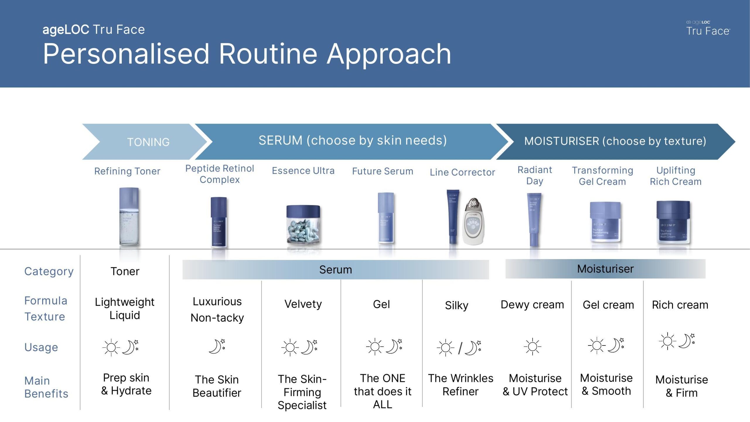 La línea se compone de ocho productos: un tónico, cuatro tipos de suero y tres tipos de crema hidratante. La idea es simple: mezcla y adapta para crear el cuidado perfecto para ti, o combínalos con otros productos de Nu Skin según las necesidades específicas de tu piel.