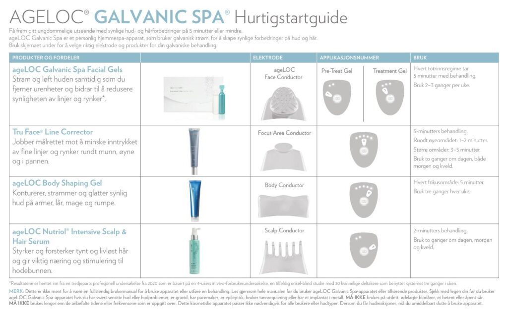 Apparatet ageLOC Galvanic Spa, i kombinasjon med kosmetiske produkter, hjelper deg med å oppnå et ungdommelig utseende fra topp til tå, takket være tilpasningsstykkene for ansikt, hodebunn og kropp. Du kommer til å bli overrasket over hvordan fine linjer og rynker blir mindre synlige, huden får ny glød, og huden virker revitalisert.