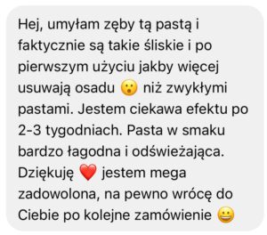 Użytkownicy zauważają, że pasta delikatnie wybiela zęby, co potwierdzają liczne opinie. Choć niektórzy oczekiwali efektu „wow”, wiele osób podkreśla widoczną różnicę w odcieniu zębów już po kilku użyciach. Jedna z recenzji zwraca uwagę na to, że choć efekt nie jest porównywalny z profesjonalnym wybielaniem, to pasta spełnia swoje zadanie .