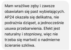 Mit, że każda wybielająca pasta niszczy szkliwo, nie znajduje tu zastosowania – AP24 nie zawiera agresywnych wybielaczy chemicznych, dzięki czemu może być używana przez osoby o wrażliwych zębach. Jednocześnie warto pamiętać, że efekty wybielania są naturalne i stopniowe – produkt nie zastąpi profesjonalnych zabiegów stomatologicznych, ale stanowi bezpieczną alternatywę dla osób poszukujących codziennej pielęgnacji z efektem rozjaśnienia.