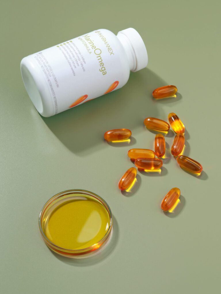 MarineOmega zawiera skoncentrowany olej rybi oraz olej z kryla antarktycznego, które dostarczają duże ilości EPA i DHA – dwóch głównych kwasów tłuszczowych omega-3.